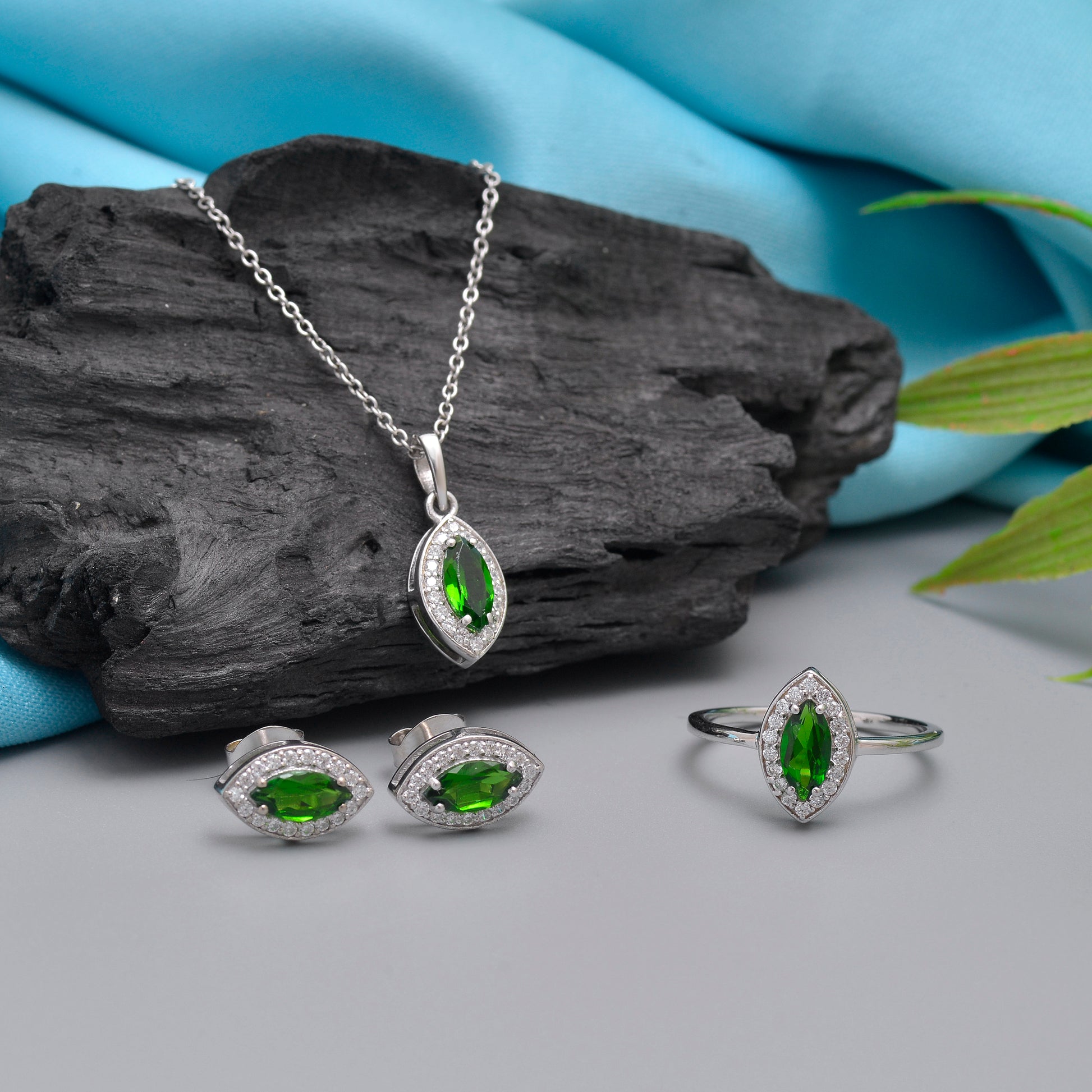 Green Grace Silver Set is a beautifully crafted collection featuring stunning Chrome Diopside stones, known for their rich, vibrant green hue. Set in high-quality silver, each piece highlights the natural beauty and uniqueness of the stones. With their deep forest-like color and elegant design, this set adds timeless charm and earthy elegance.