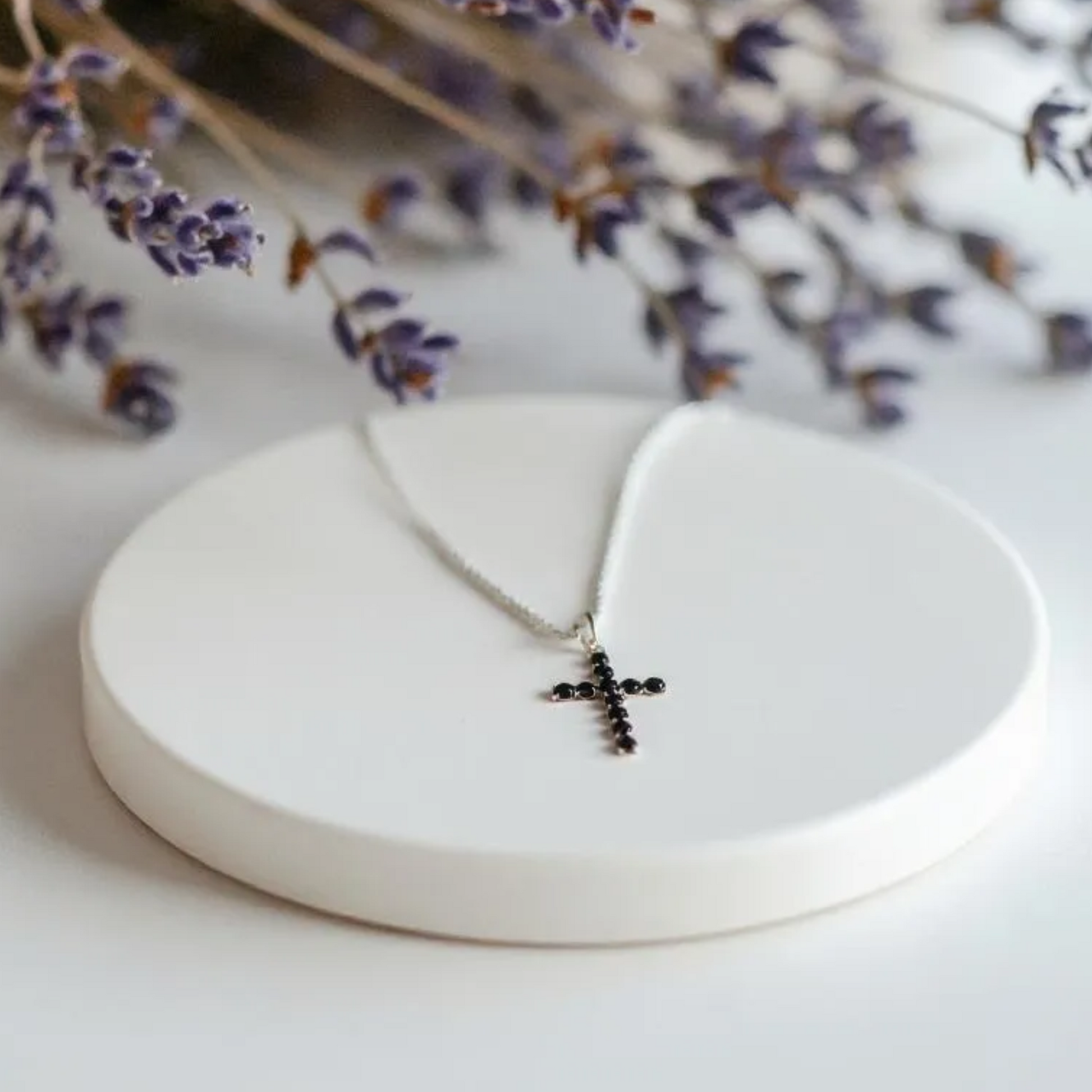 Crafted from pure 925 sterling silver with a matte, the Mini Black Spinel Silver Cross features natural black spinel gemstones known for promoting grounding energy and clarity. This compact, lightweight pendant offers a subtle yet meaningful cross design, perfect for daily spiritual wear or layering. Each piece is handcrafted with care, blending minimalist elegance with symbolic depth for those seeking a refined expression of faith and inner strength.