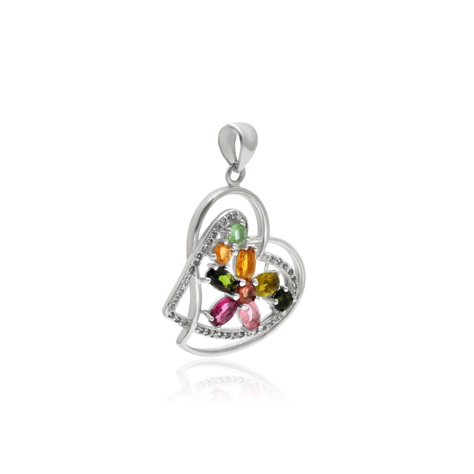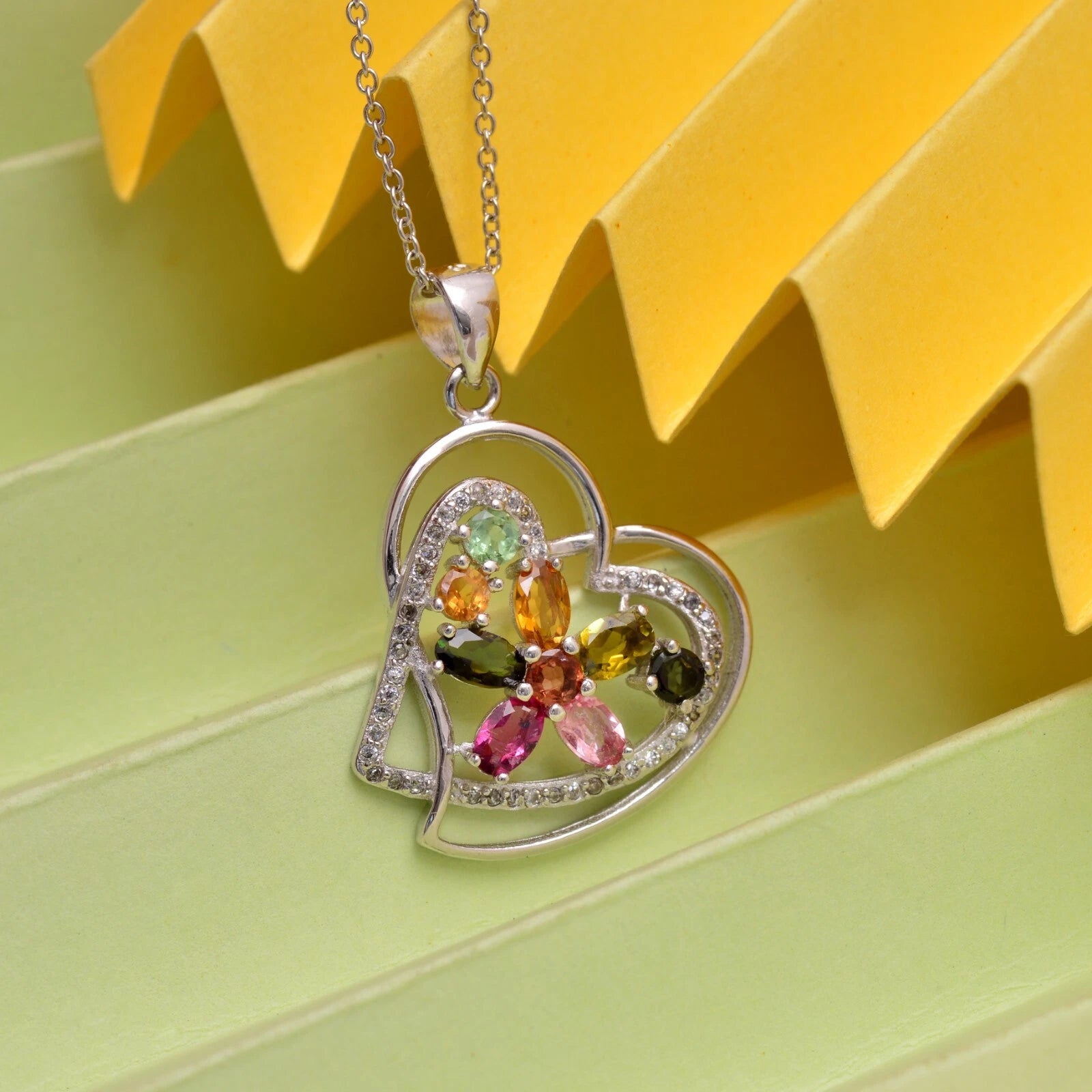 This exquisite silver heart pendant features a vibrant floral arrangement crafted from multi-colored gemstones, including pink tourmaline, peridot, and citrine. Expertly designed with intricate detailing, it highlights the high clarity and quality of each stone, creating a sophisticated and timeless piece. Ideal for anniversaries, gifts, or elegant occasions, this pendant combines classic charm with modern elegance, making it a perfect addition for those who appreciate refined craftsmanship and chic style.